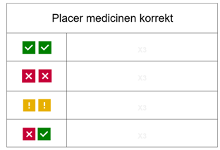 I denne øvelse skal får deltagerne 12 forskellige medicinske præparater som de skal placere på medicinpladen, alt efter om de tror at medicinen er grøn, rød, gul, grøn/grøn eller grøn/rød.